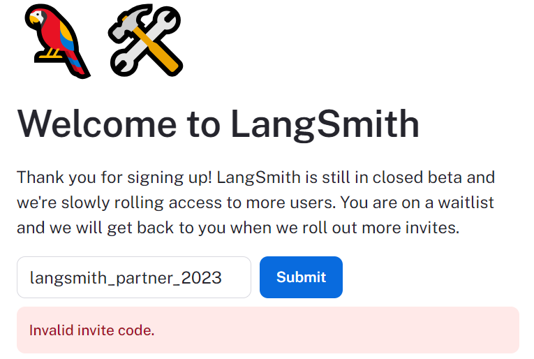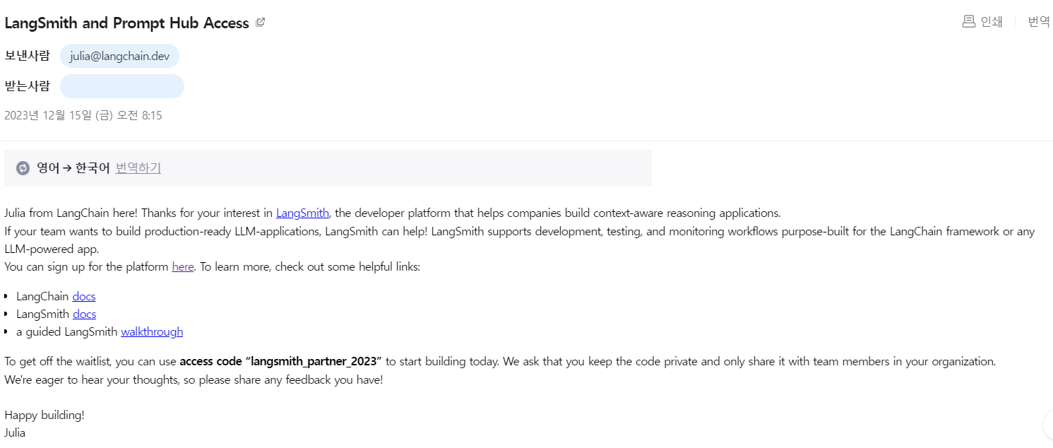 - Langsmith Access Code 라는 메일을 받아야 접속할 수 있는 것인가 싶기도 하다.