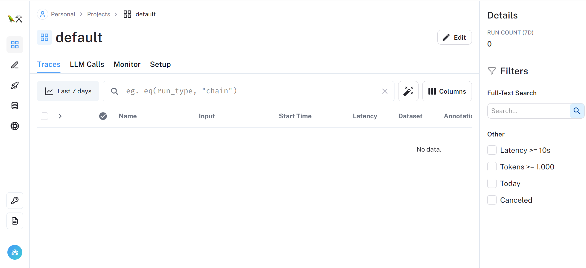 - Env를 설정하였지만 Project로 나의 langchain 실행내역이 아직은 수집되지 않고 있다.